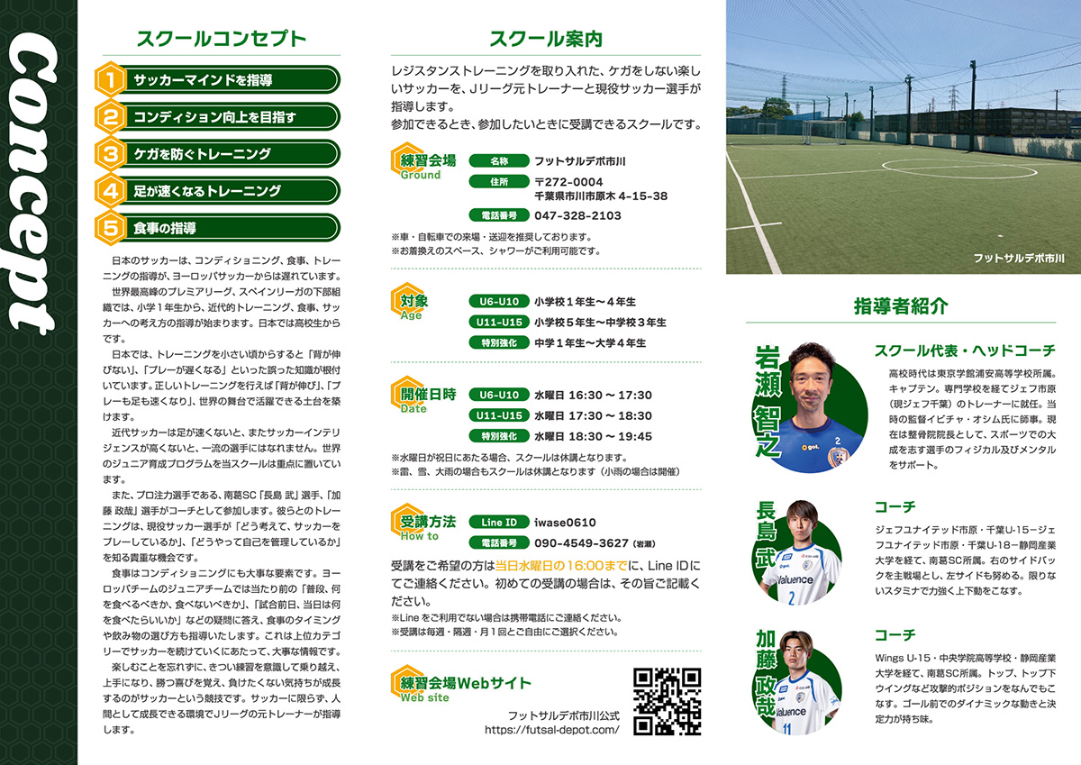 新たに始めるサッカー教室として、スクールの特徴と理念を宣伝する目的で、関係店舗に置いて興味を覚えた方に手に取っていただけるよう心掛けたパンフレットです。